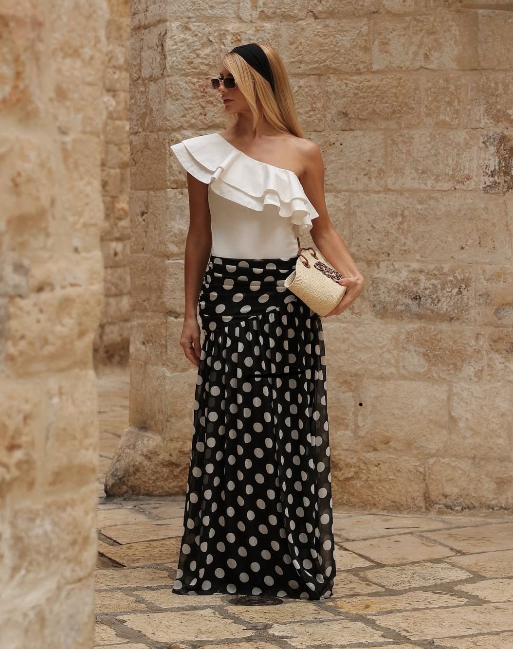 Detalhes do Design: O body aposta na tendência um ombro só one-shoulder trazendo uma assimetria elegante e sutilmente sensual O diferencial fica por conta do babado duplo grandioso em tricoline que adorna a alça única criando um toque romântico e dramático na medida certa A combinação de tecidos justos e volumosos cria um equilíbrio visual moderno e atraente.