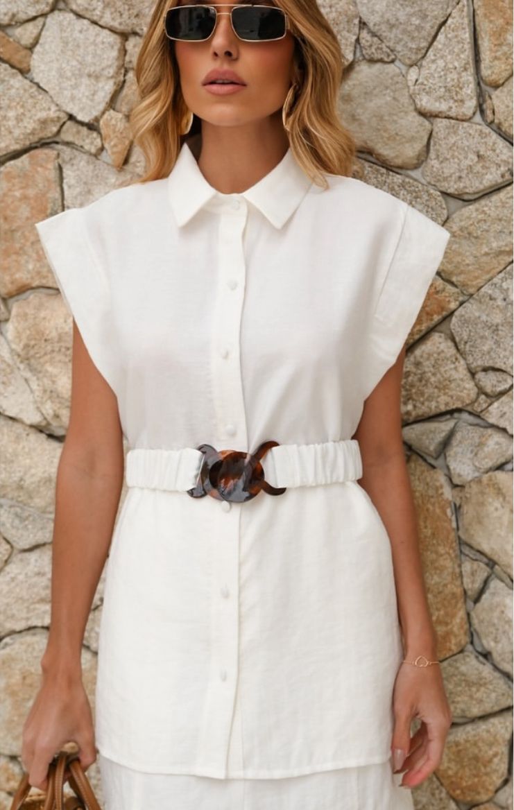 A camisa Felice em alfaiataria é confeccionada em viscose leve, garantindo conforto e fluidez ao vestir. O design é sofisticado, com gola clássica e fechamento frontal por botões delicados, que trazem um toque elegante e atemporal. O destaque fica por conta das mangas amplas e estruturadas, que criam uma silhueta moderna e cheia de estilo. A peça acompanha um cinto com detalhe em lastex e fivela em efeito tartaruga, marcando a cintura de forma sutil e valorizando a modelagem. Disponível nas cores preto e off-white, é uma escolha versátil e elegante, perfeita para compor looks casuais chic ou produções mais elaboradas.