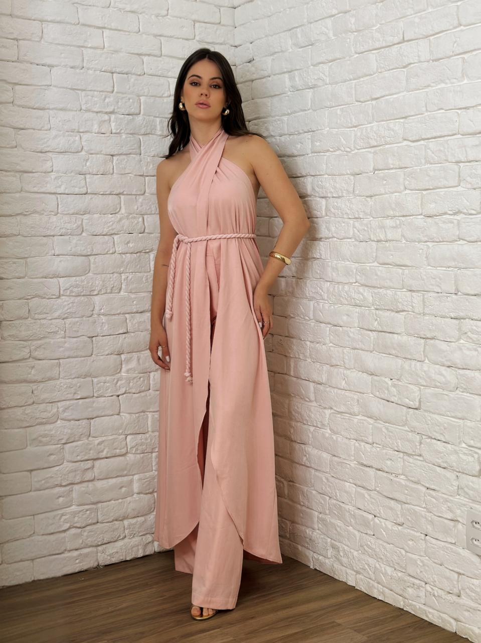 A peça superior apresenta um decote halter neck cruzado que se amarra no pescoço, destacando os ombros e o colo com sensualidade sutil. O corpo da blusa é solto e alongado, com aberturas laterais que caem sobre as pernas, criando uma sobreposição elegante sobre a calça.