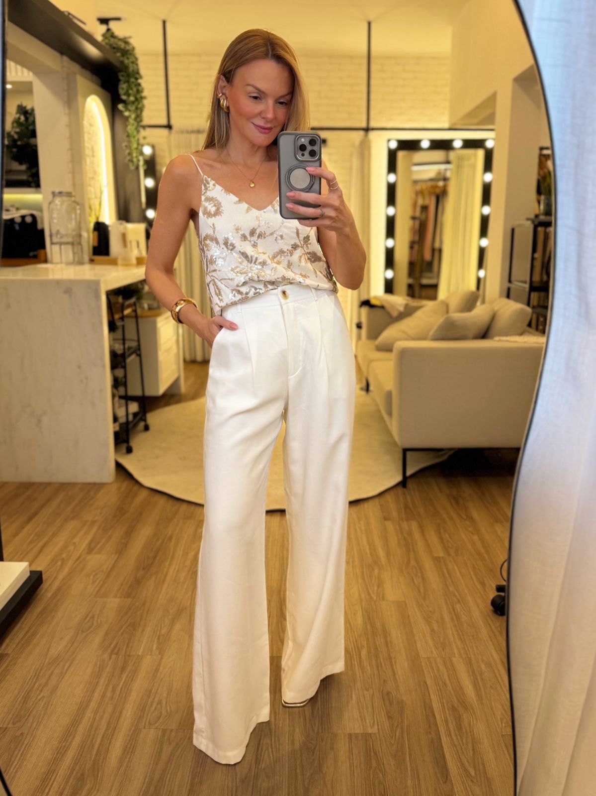 A blusa traz um charme especial com seu bordado em paetês, combinando tons neutros e dourados que iluminam o look. Feita em viscose com linho, ela tem caimento leve, confortável e acabamento impecável.