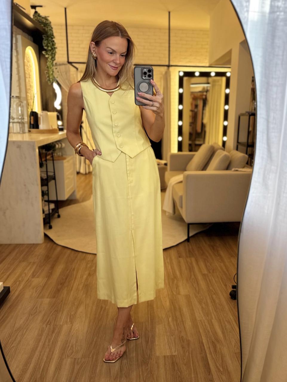 A saia midi possui corte reto e fenda frontal sutil, que adiciona feminilidade e liberdade de movimento. O comprimento clássico e o acabamento limpo tornam o conjunto versátil e atemporal.
